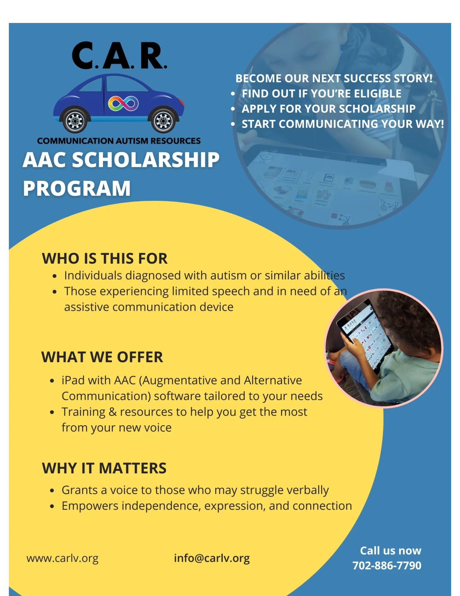 The AAC Scholarship program is designed to provide an iPad and communication app to individuals on the autism spectrum a who are non-verbal or limited in language. Only complete applications will be accepted (please read the application in detail and provide all necessary documents).